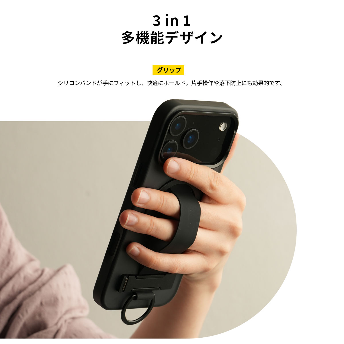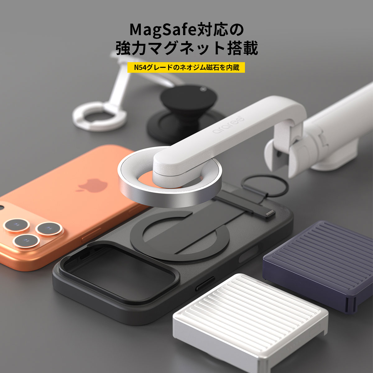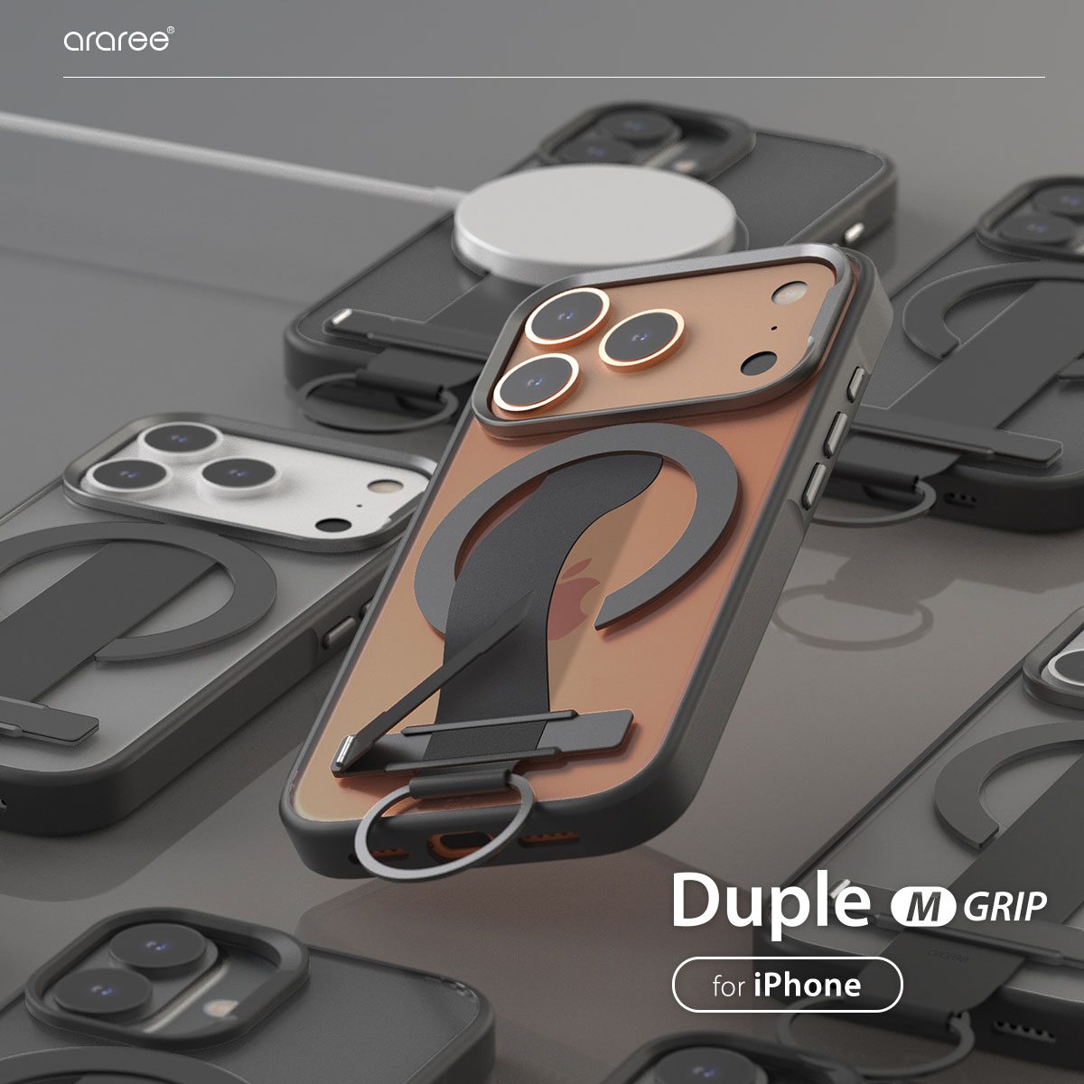 araree の「DUPLE M GRIP」は、耐衝撃性能に優れたミルスペック準拠の MagSafe対応iPhoneケースです。折りたたみ式のメタルスタンド、シリコン製グリップ、Dリングを搭載し、使いやすさと安心感を同時に提供します。