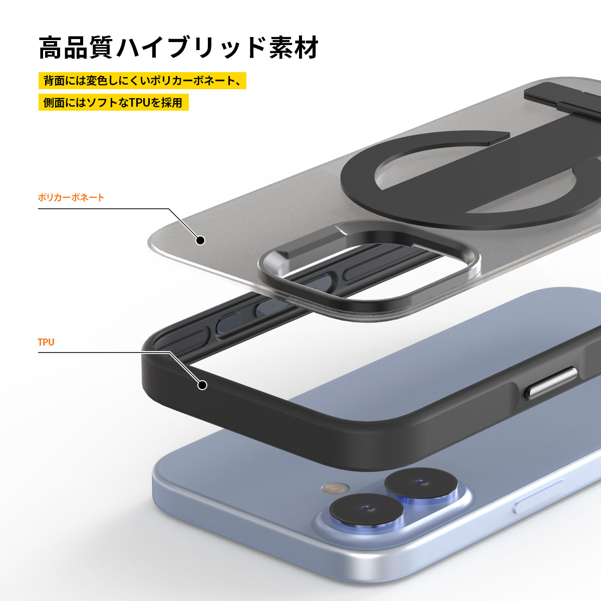 背面には変色しにくいポリカーボネート、側面にはソフトなTPUを採用。優れた耐久性と着脱性を実現しました。
