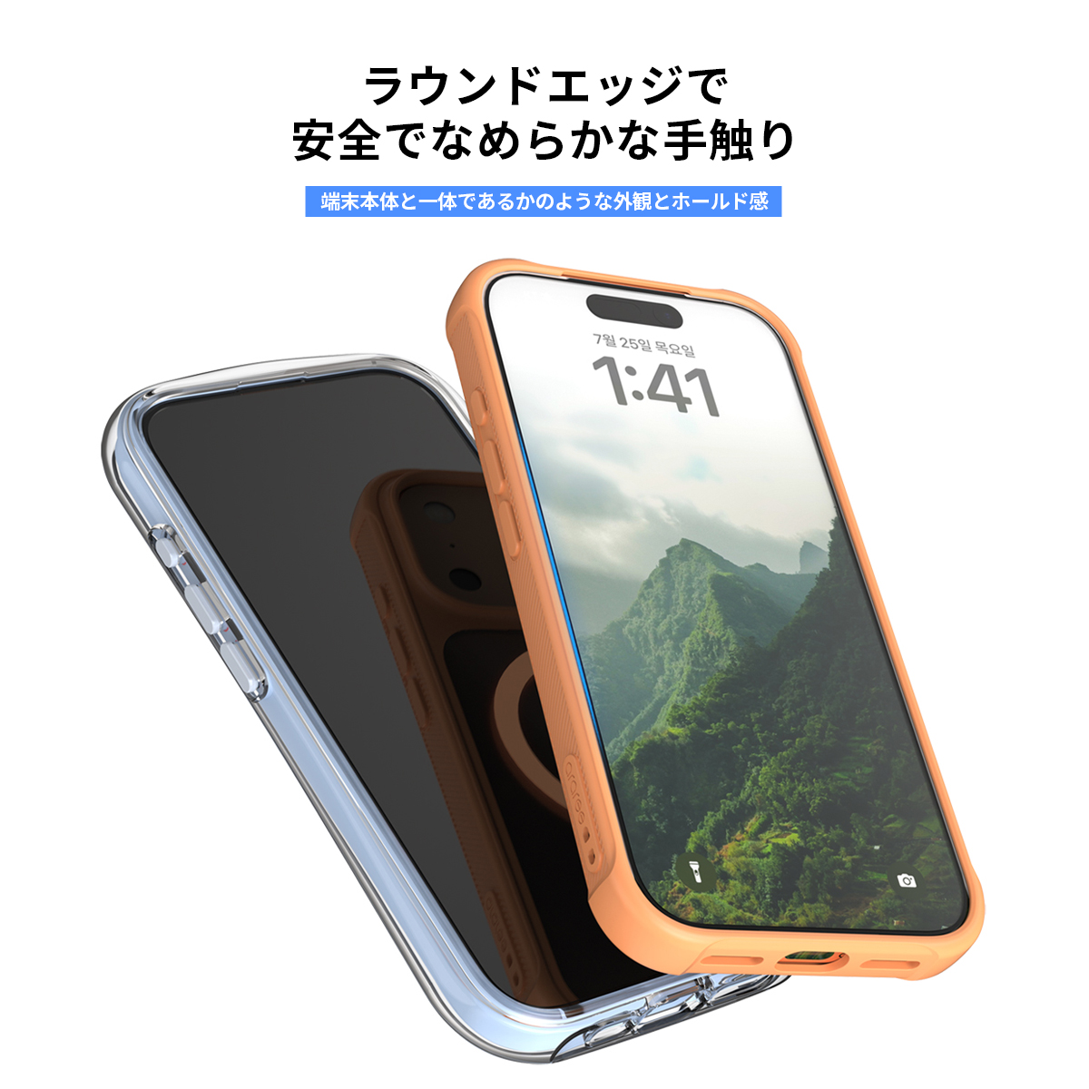 ラウンドエッジ加工することで手にした時のなめらかなエッジを実現し、端末本体と一体であるかのような外観とホールド感です。