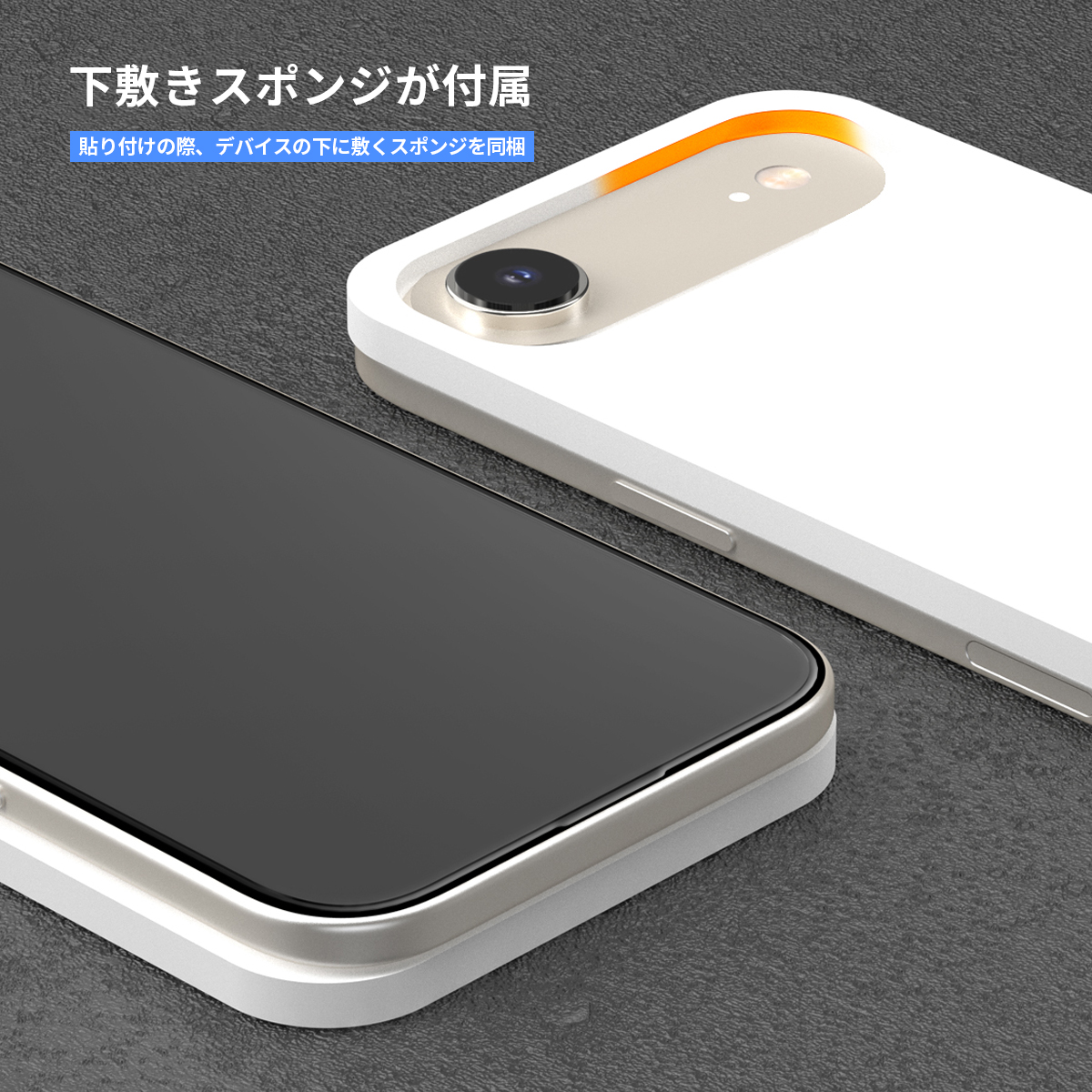 貼り付けの際、デバイスの下に敷くスポンジを同梱しています。背面カメラが突き出したスマートフォンを安定させ、簡単にフィルムを貼り付けられます。