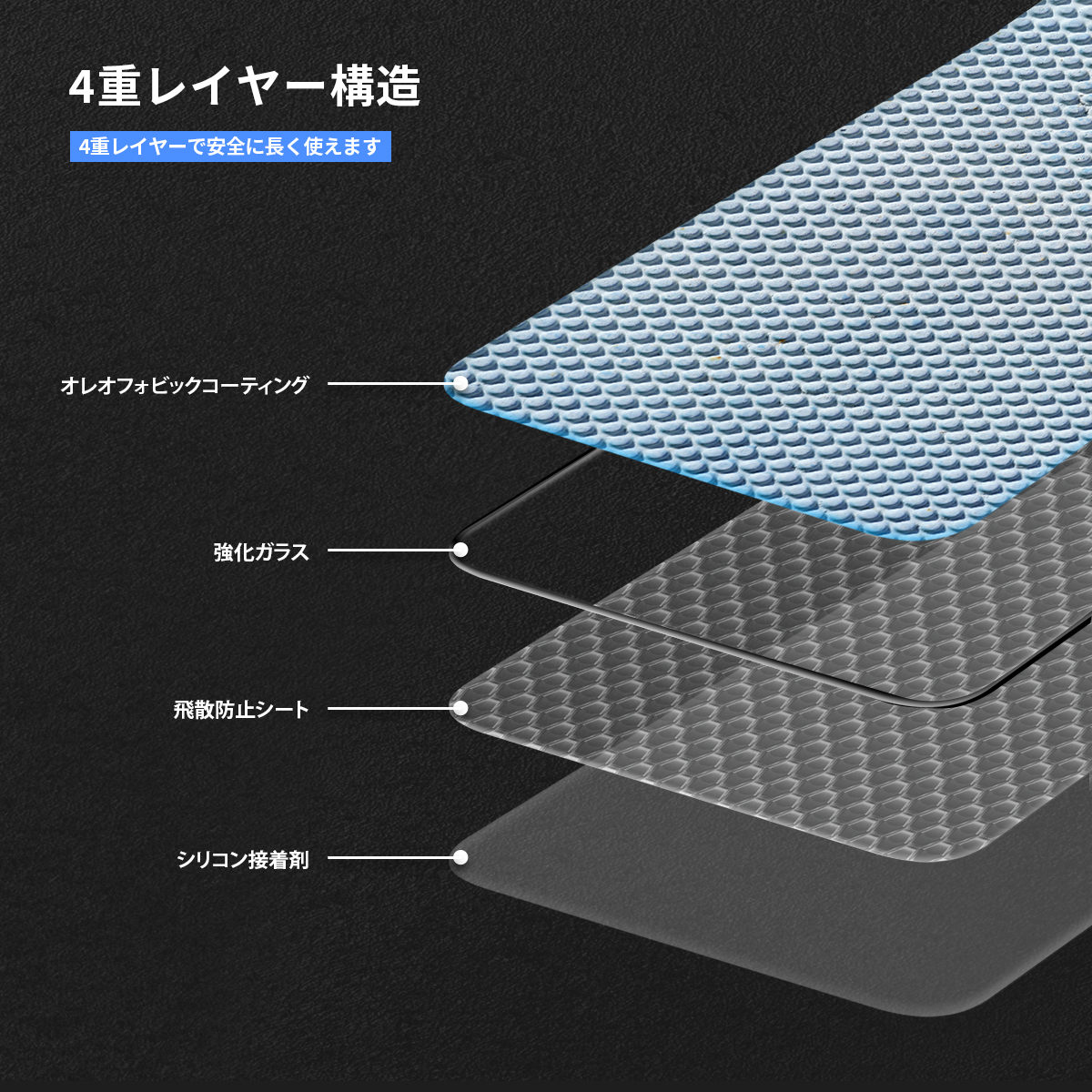 シリコン接着剤、飛散防止シート、強化ガラス、油分・指紋などの汚れに強いオレオフォビックコーティングの4重レイヤーで安全に長く使えます。