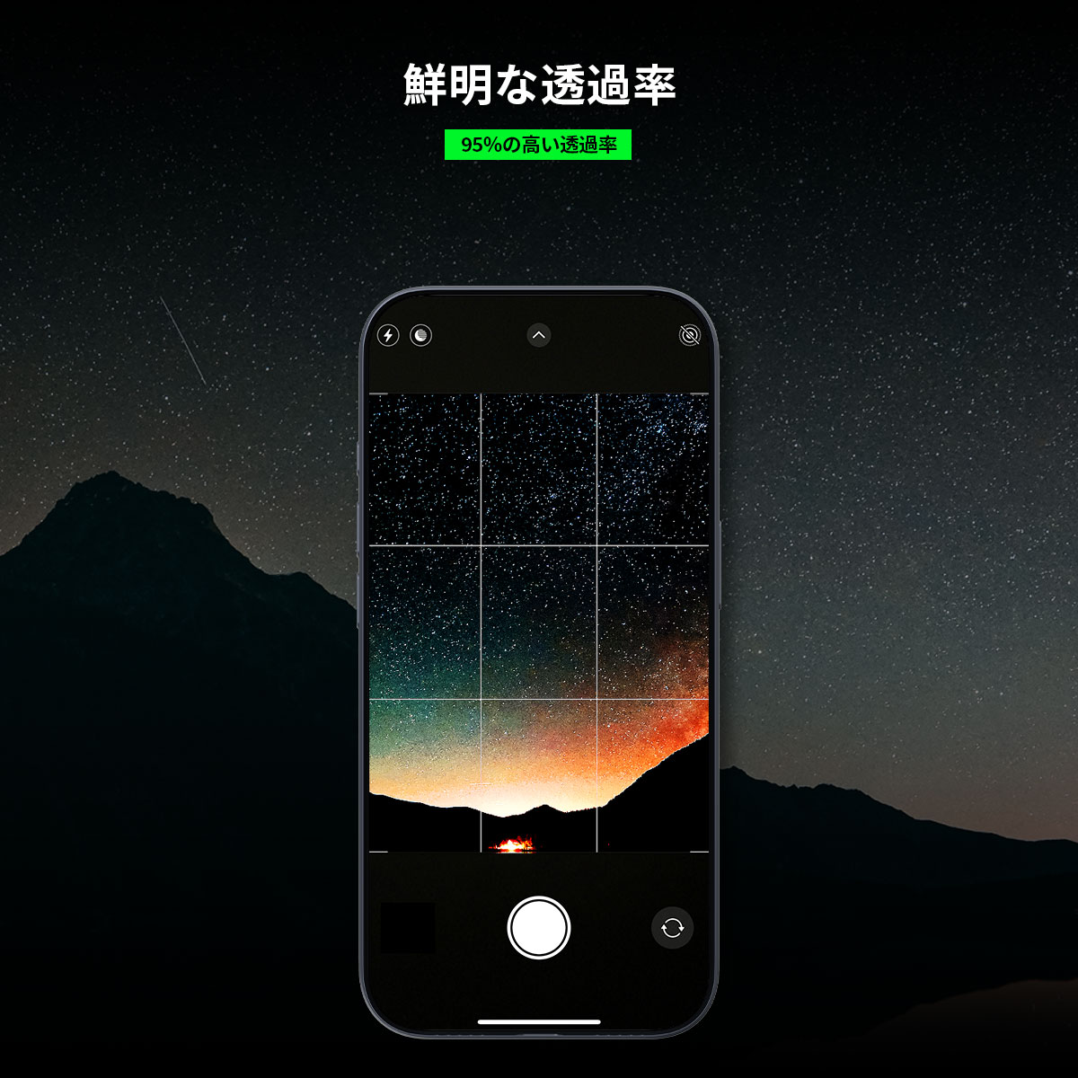 95%の高い透過率。より鮮明なカメラ性能を実現するため、反射防止コーティングも施しています。