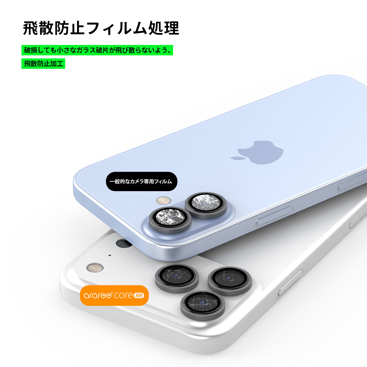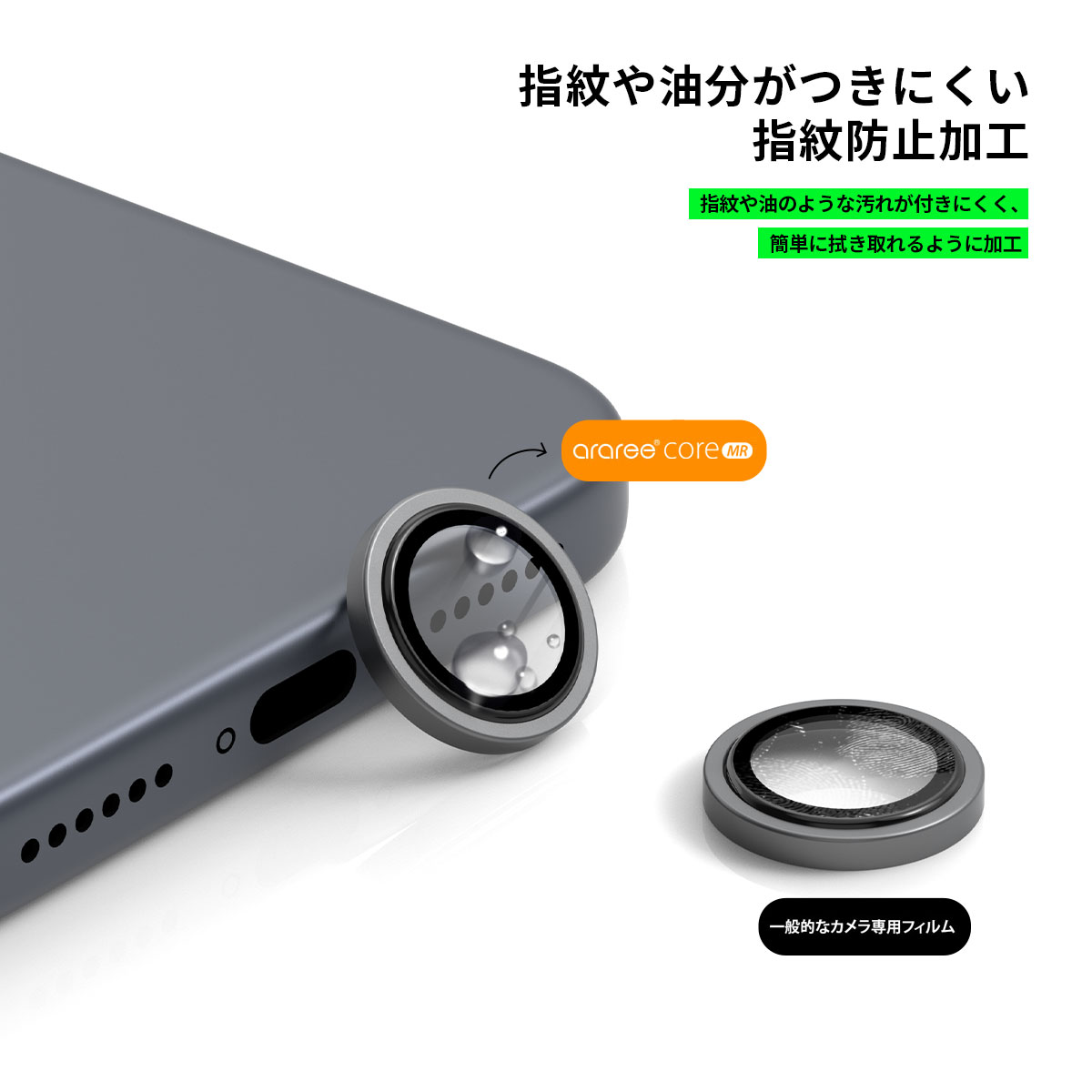 arareeの「CORE MR」は、各カメラレンズに個別に装着するセパレート式のカメラ専用強化ガラスフィルムです。端末と一体化したような自然な仕上がりで、日常の傷からしっかり保護します。